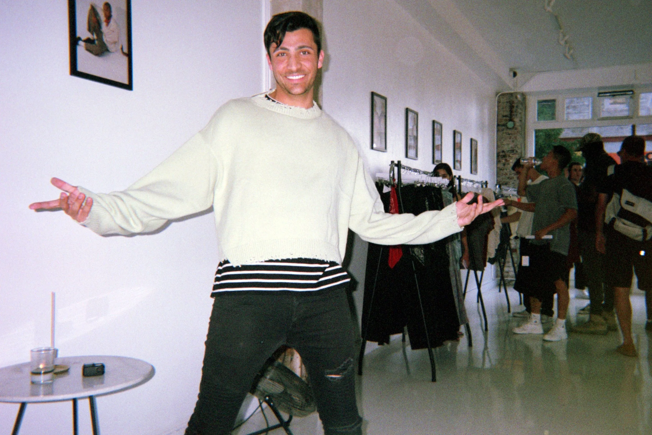 When we arrived, a line of people had already formed, spanned an entire city block. Inside the gallery were three racks of clothes and a white coffee table displaying two stacks of neatly folded sweaters. Sun rays swept through the gallery space as shoppers got to feel and try on collection three for the first time.