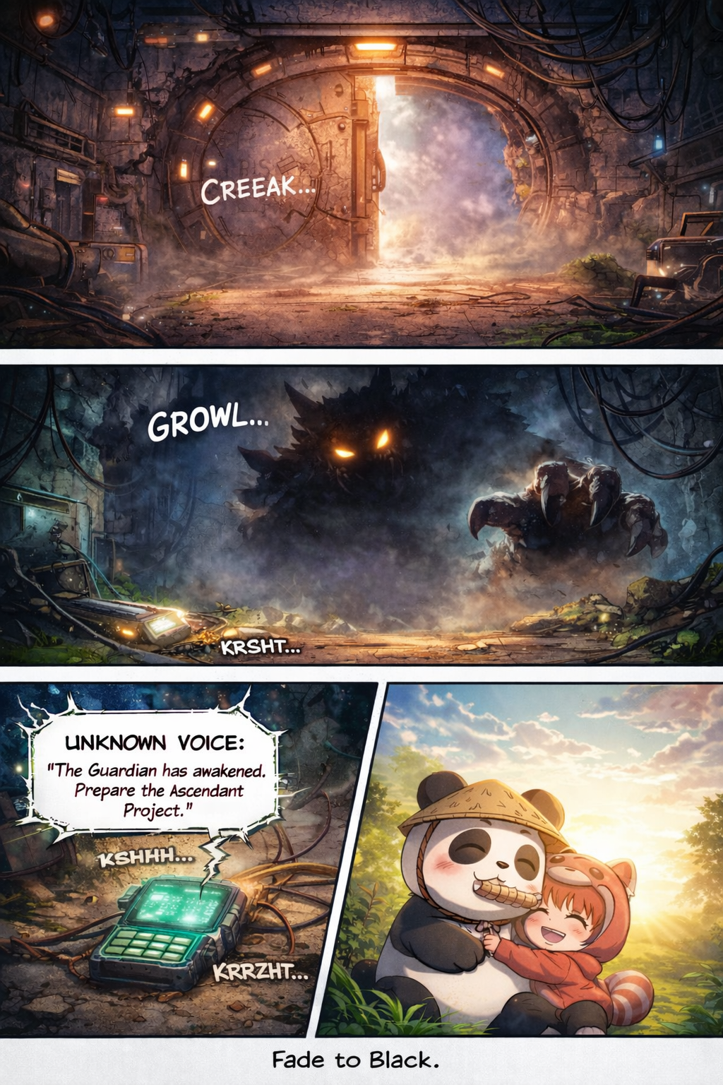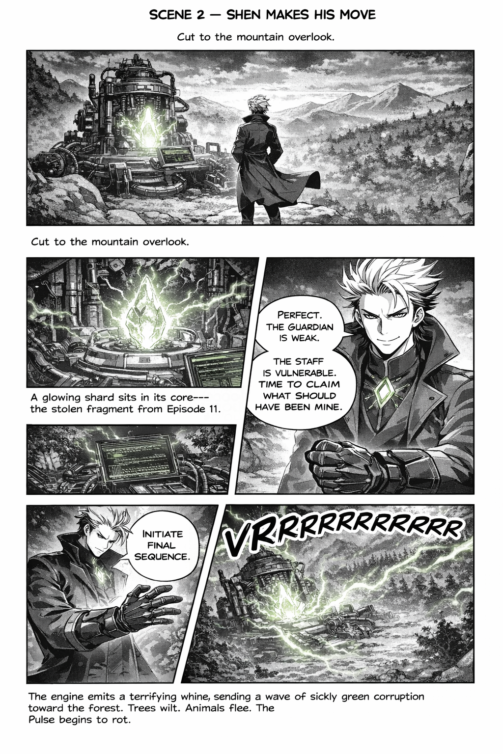 Dr. Shen stands before a mobile Pulse Engine—smaller than the fortress model, but active and humming with corrupted bamboo energy.