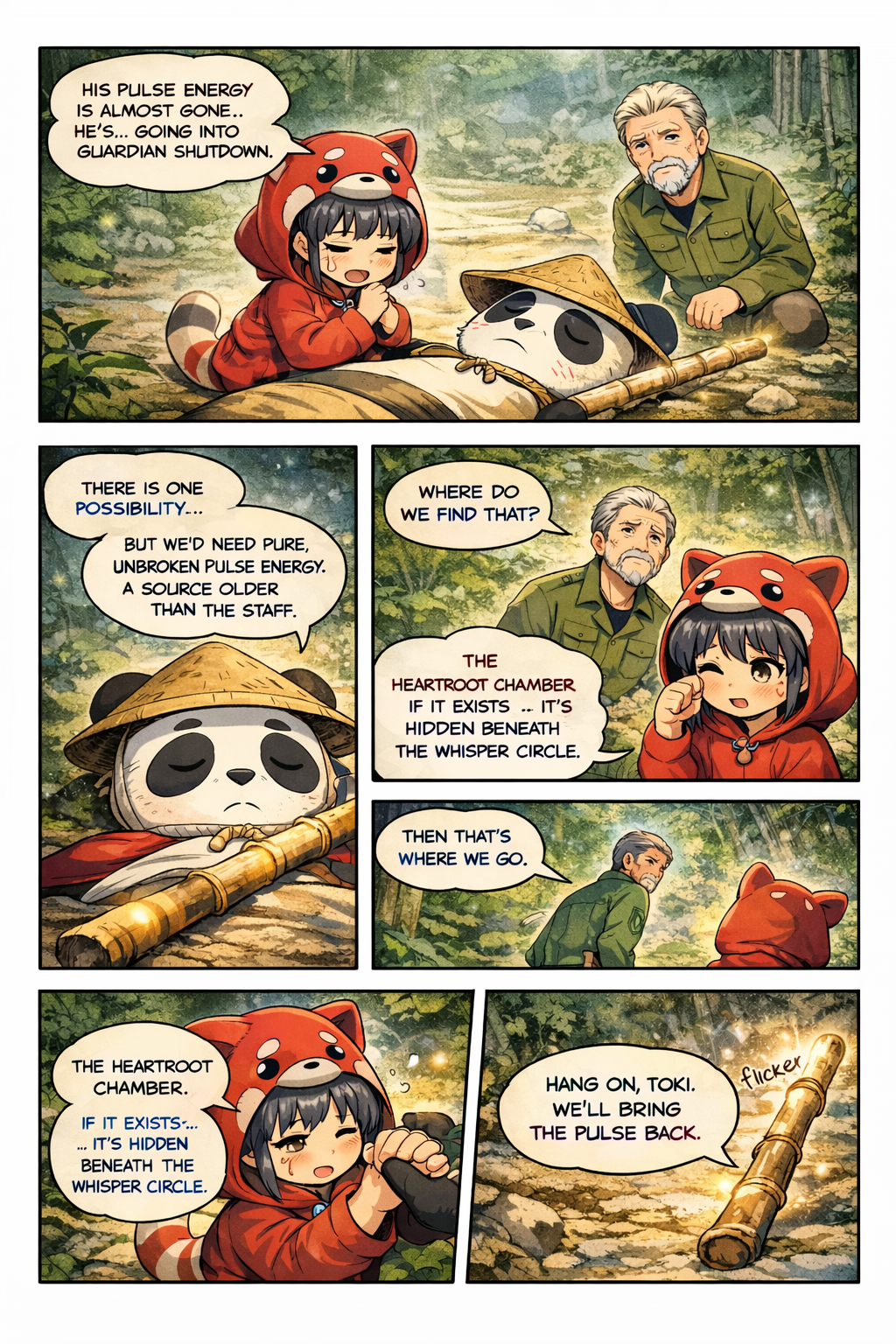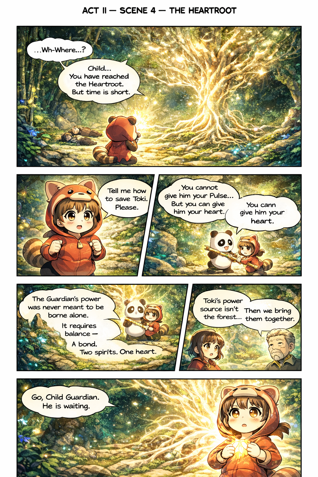 TokiToki awakens underground—inside a massive cavern illuminated by glowing roots of ancient bamboo. The Heartroot Chamber.