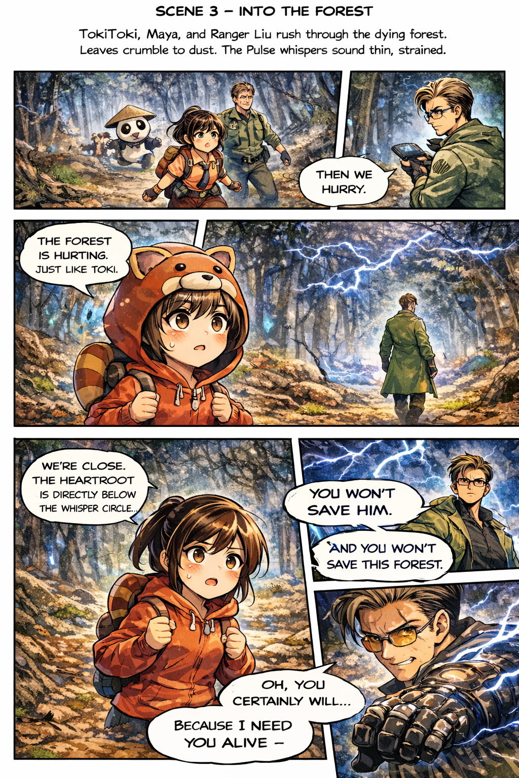 TokiToki, Maya, and Ranger Liu rush through the dying forest.