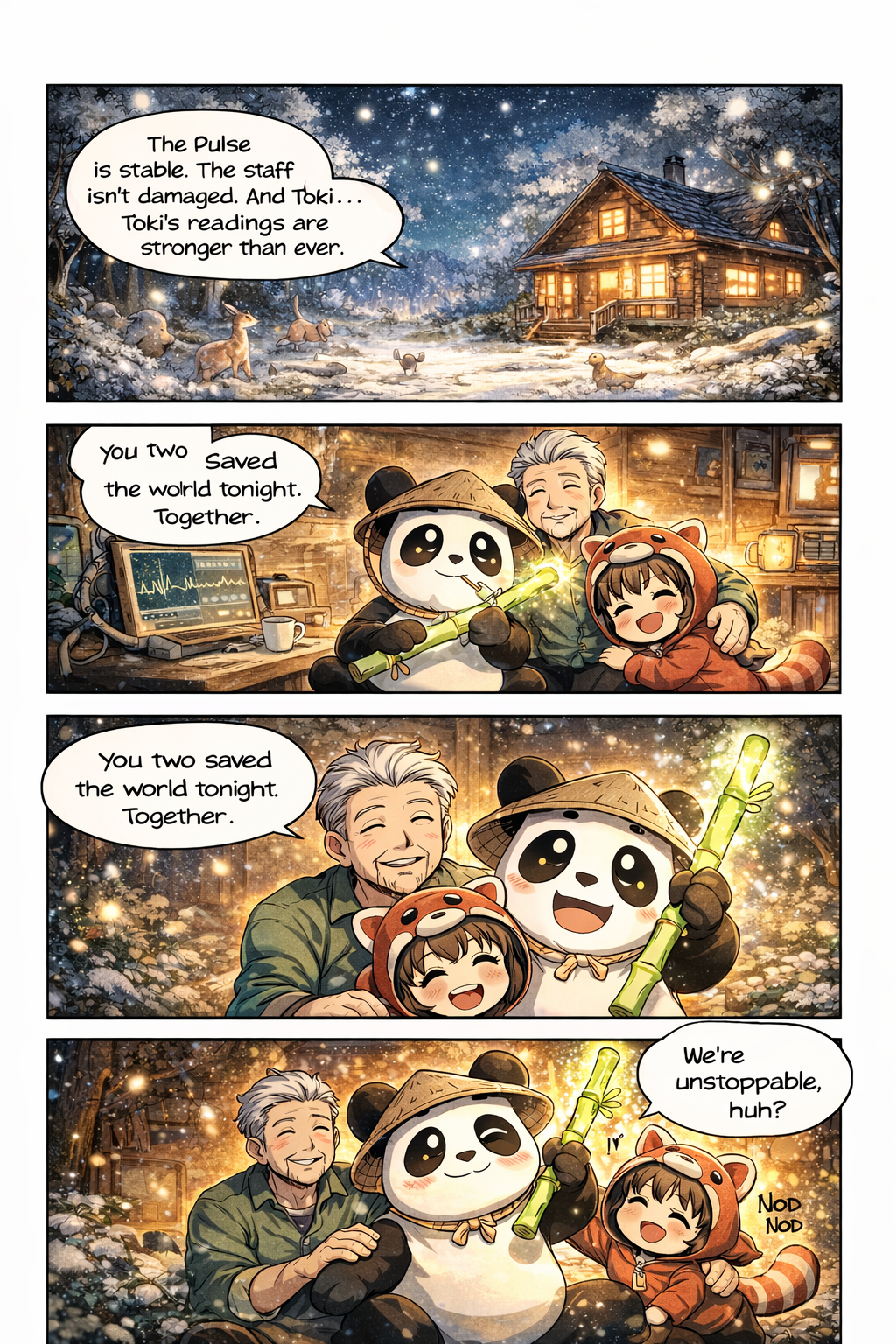 TokiToki stands beside him, holding the staff with him.