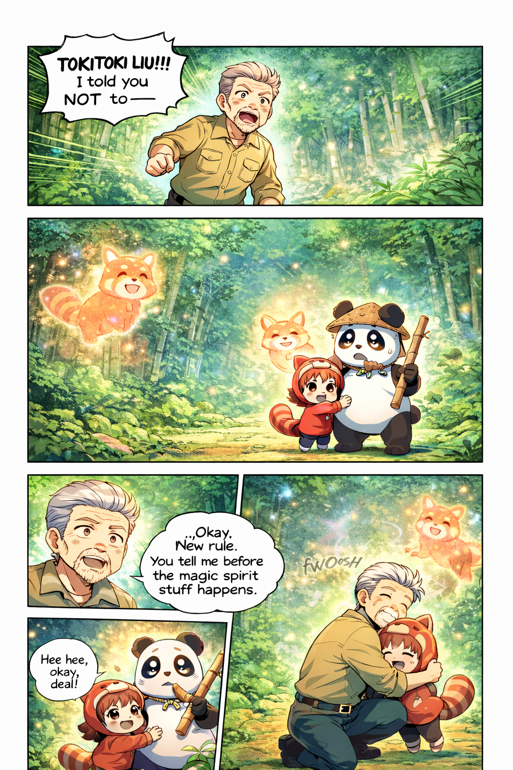 TokiToki, Toki, and two red-panda spirits stare at him.