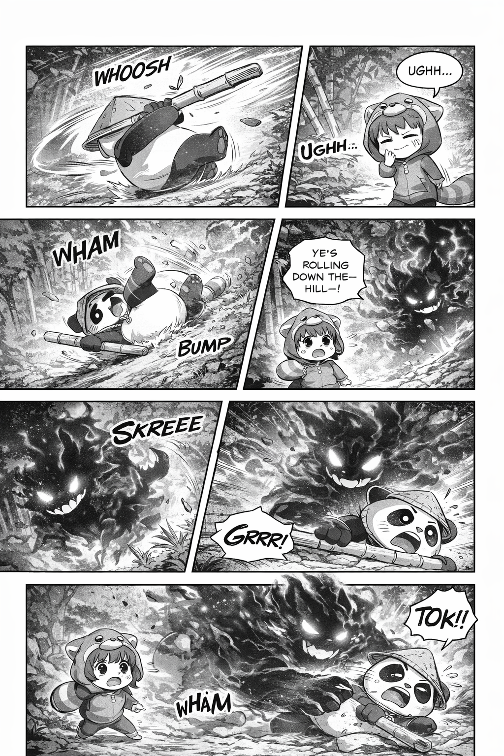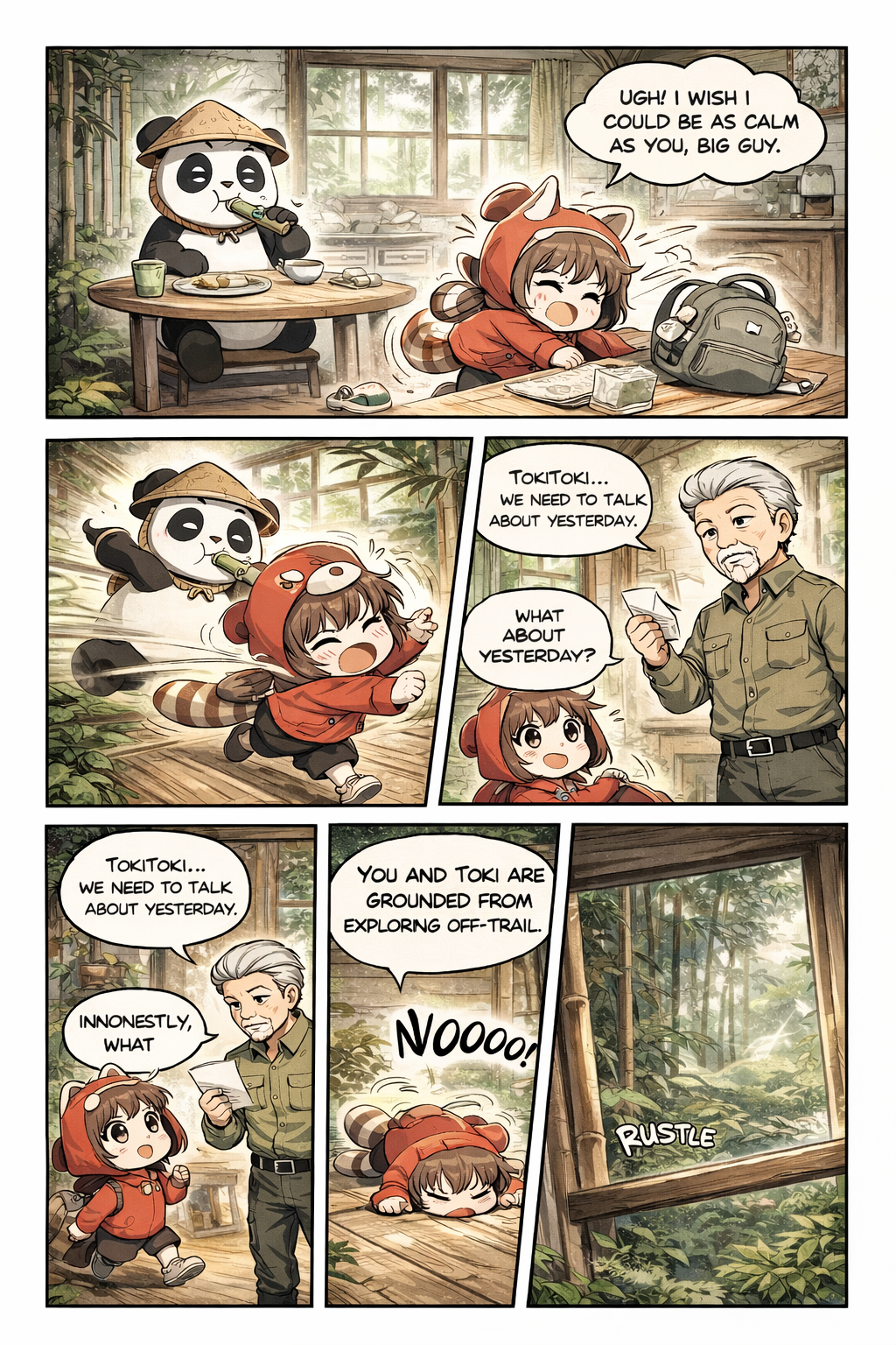 Toki has been secretly following her (not allowed to leave school grounds, but he’s a panda—nobody stops him).