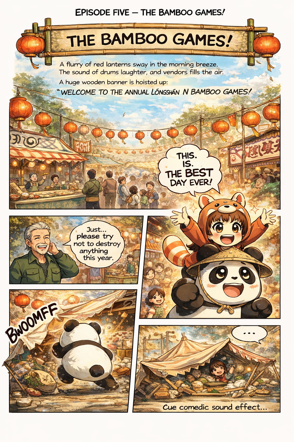 The festival bustles with activity: game booths, martial arts demonstrations, food stalls, panda-themed treats, and villagers in traditional outfits.