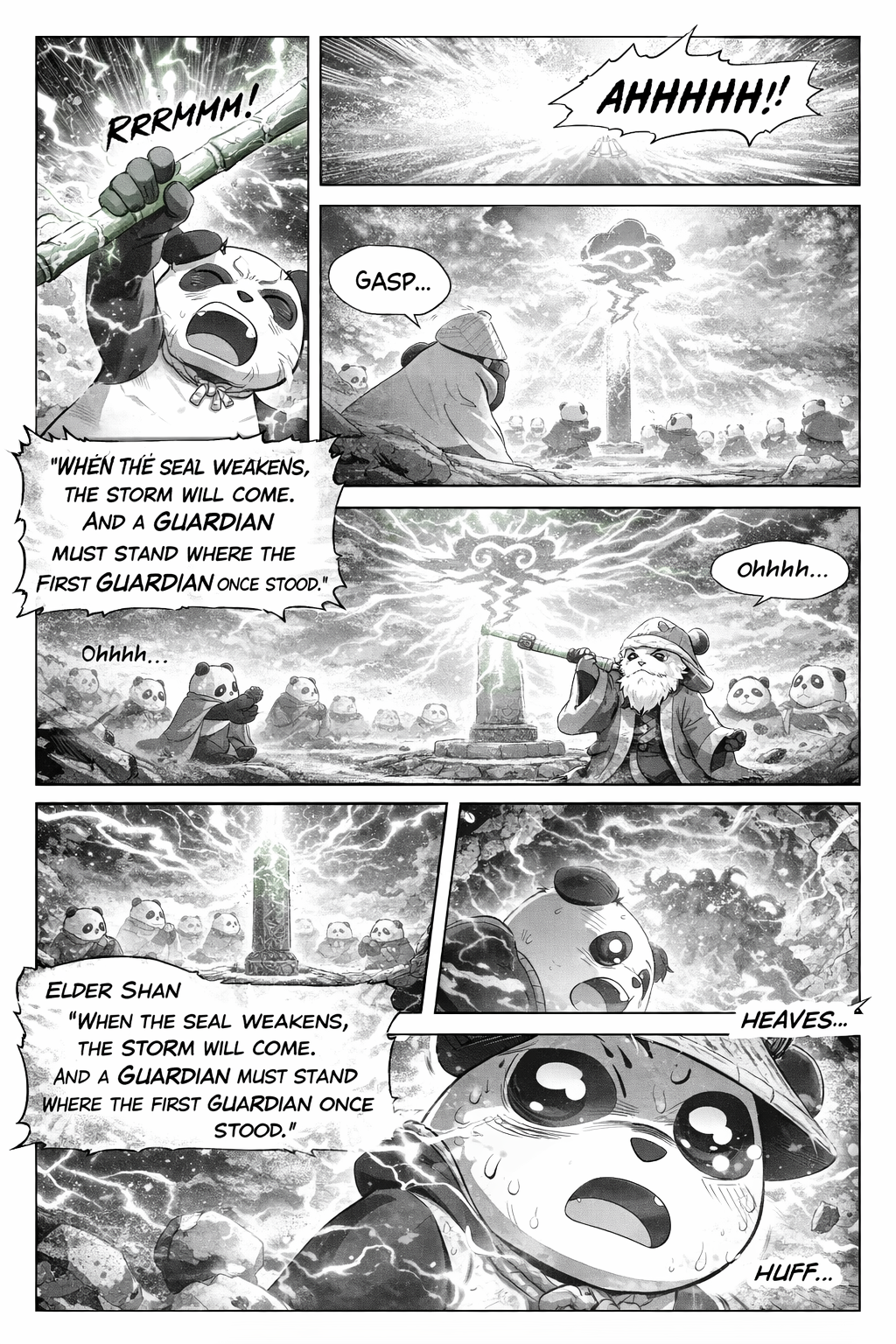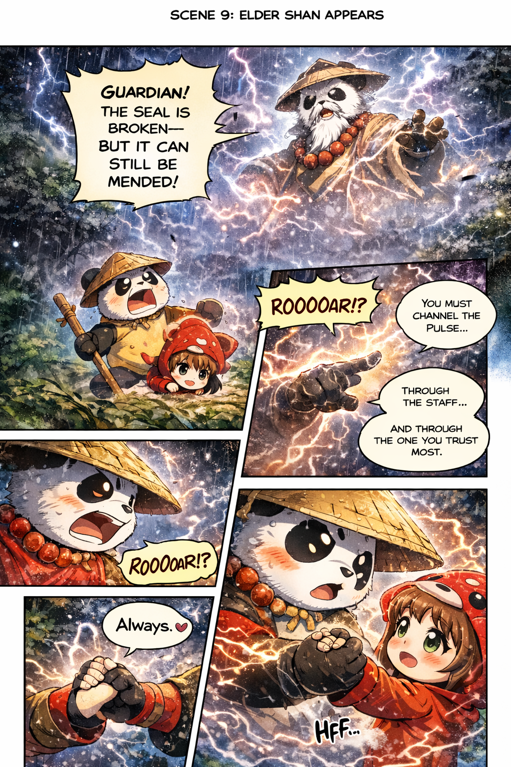 Elder Shan raising a glowing bamboo staff
