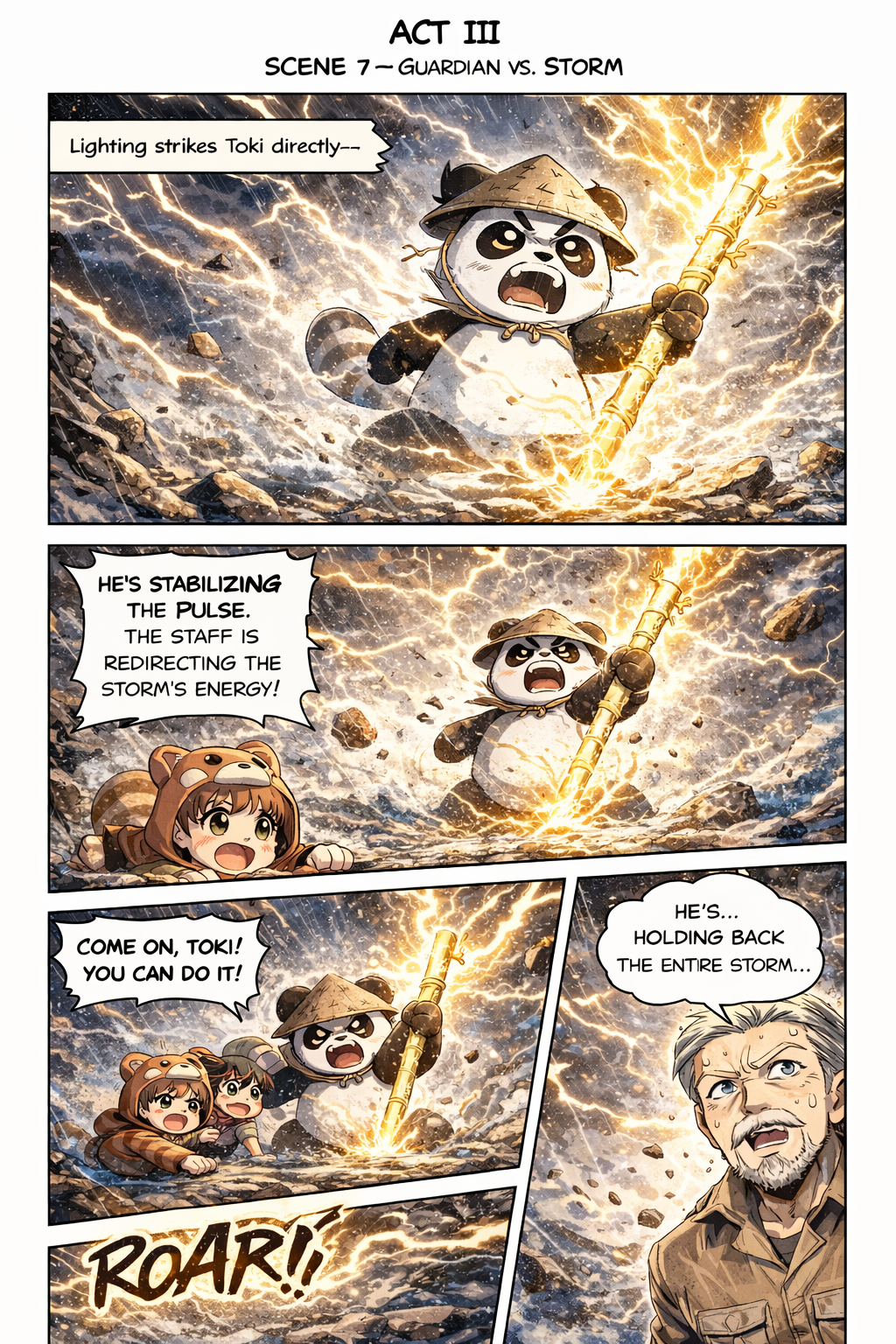 Toki roars softly, trying to calm them, but he’s shaken too.